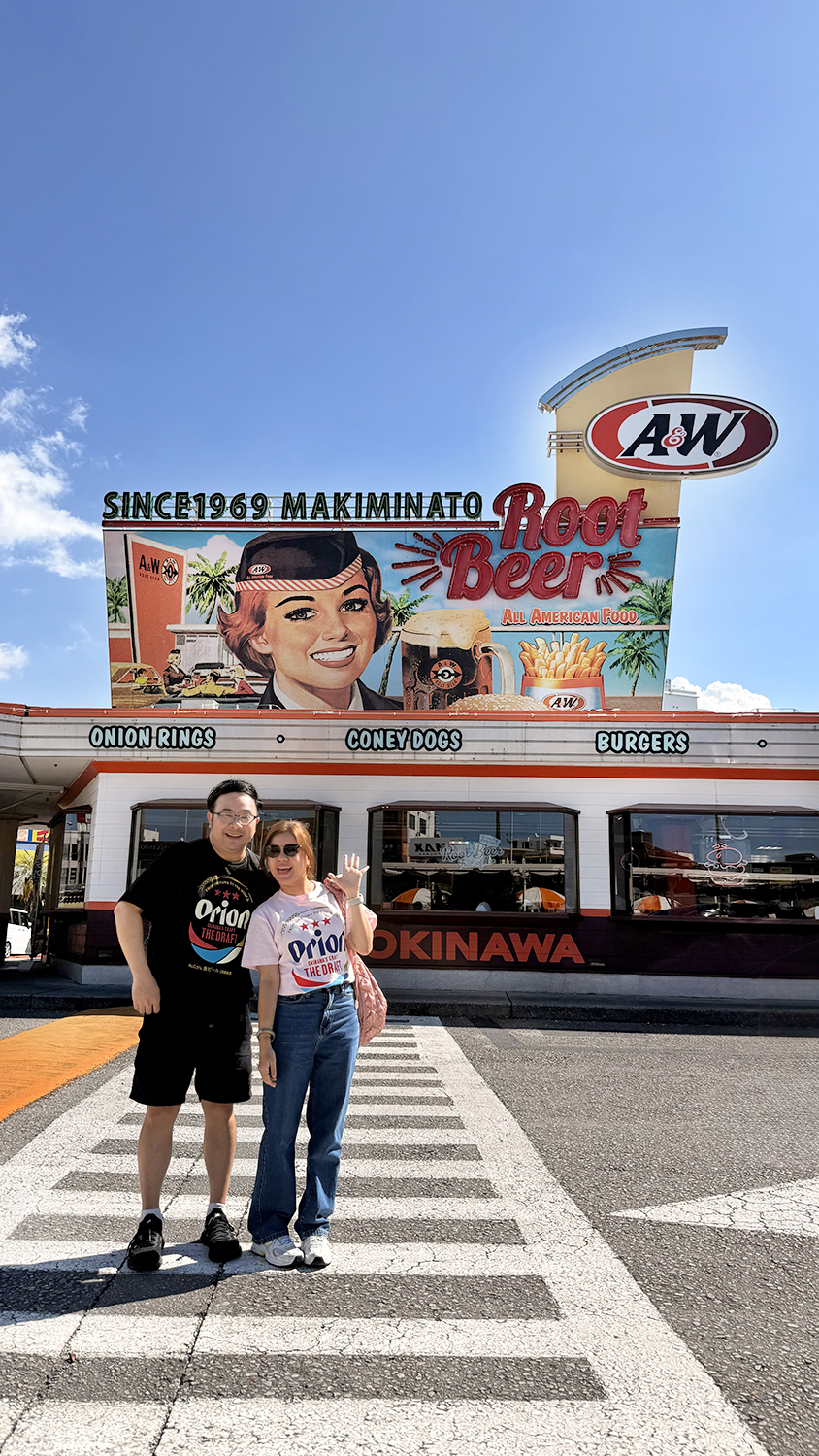 ก่อนกลับเข้าเมือง แวะเติมพลังที่ A&W Makiminato ร้านเบอร์เกอร์เก่าแก่ที่เป็นตำนานของเกาะนี้ จุดเด่นคือรูทเบียร์โฟลตและเบอร์เกอร์สไตล์อเมริกันที่หากินไม่ได้ในญี่ปุ่นแผ่นดินใหญ่ ที่นี่ คนแน่นมาก แต่ต้องมาให้ได้ เป็นจุดเช็คอินที่คนมาเที่ยวโอกินาว่าไม่พลาด !!! ถ่ายรูปมาอย่างกับอยู่ อเมริกา ^^