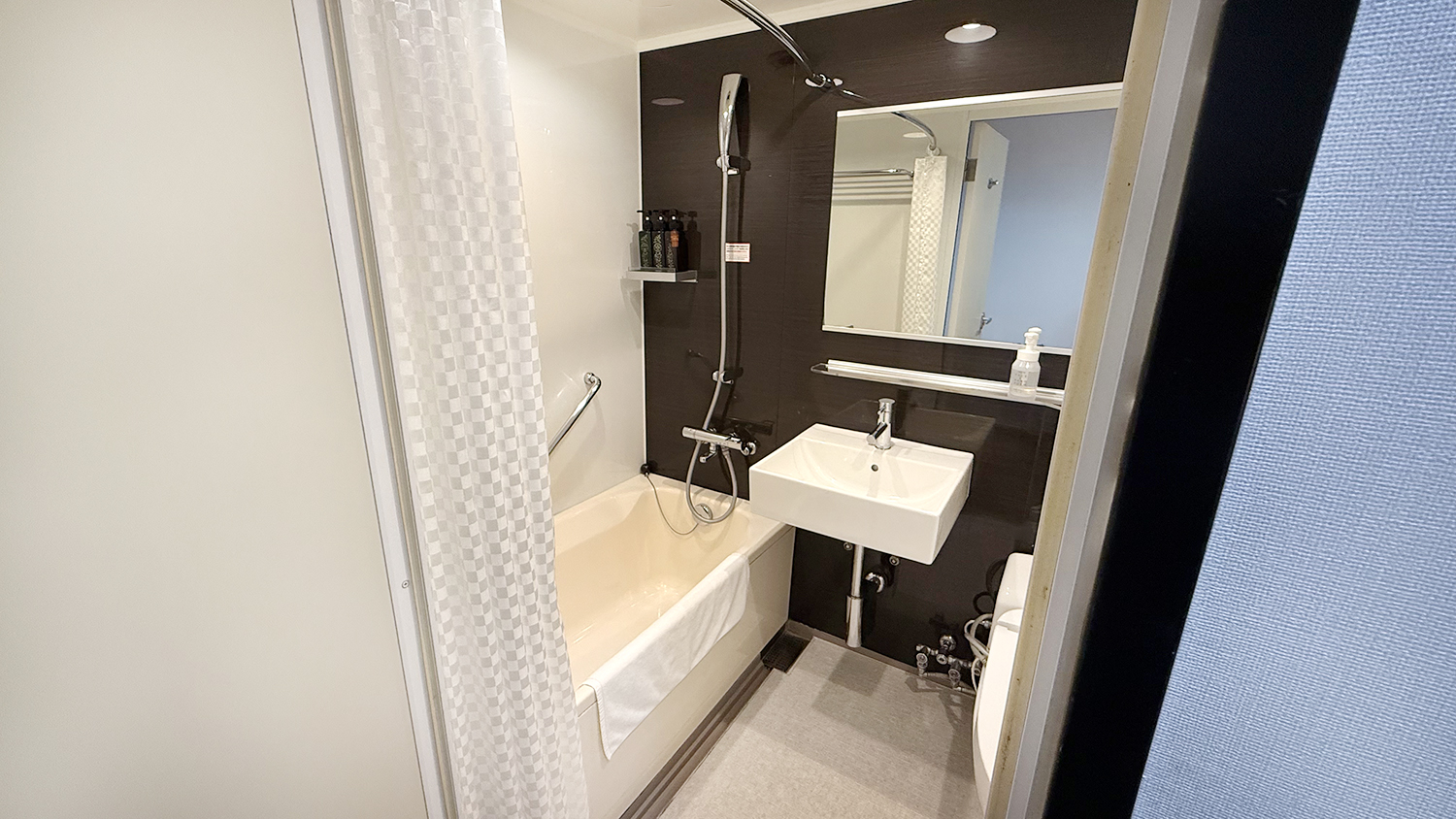 ห้องน้ำก็มีอ่างอาบน้ำเล็กๆ เหมือนเดิม น้ำแรง ร้อน มีชักโครกระบบอัตโนมัติ