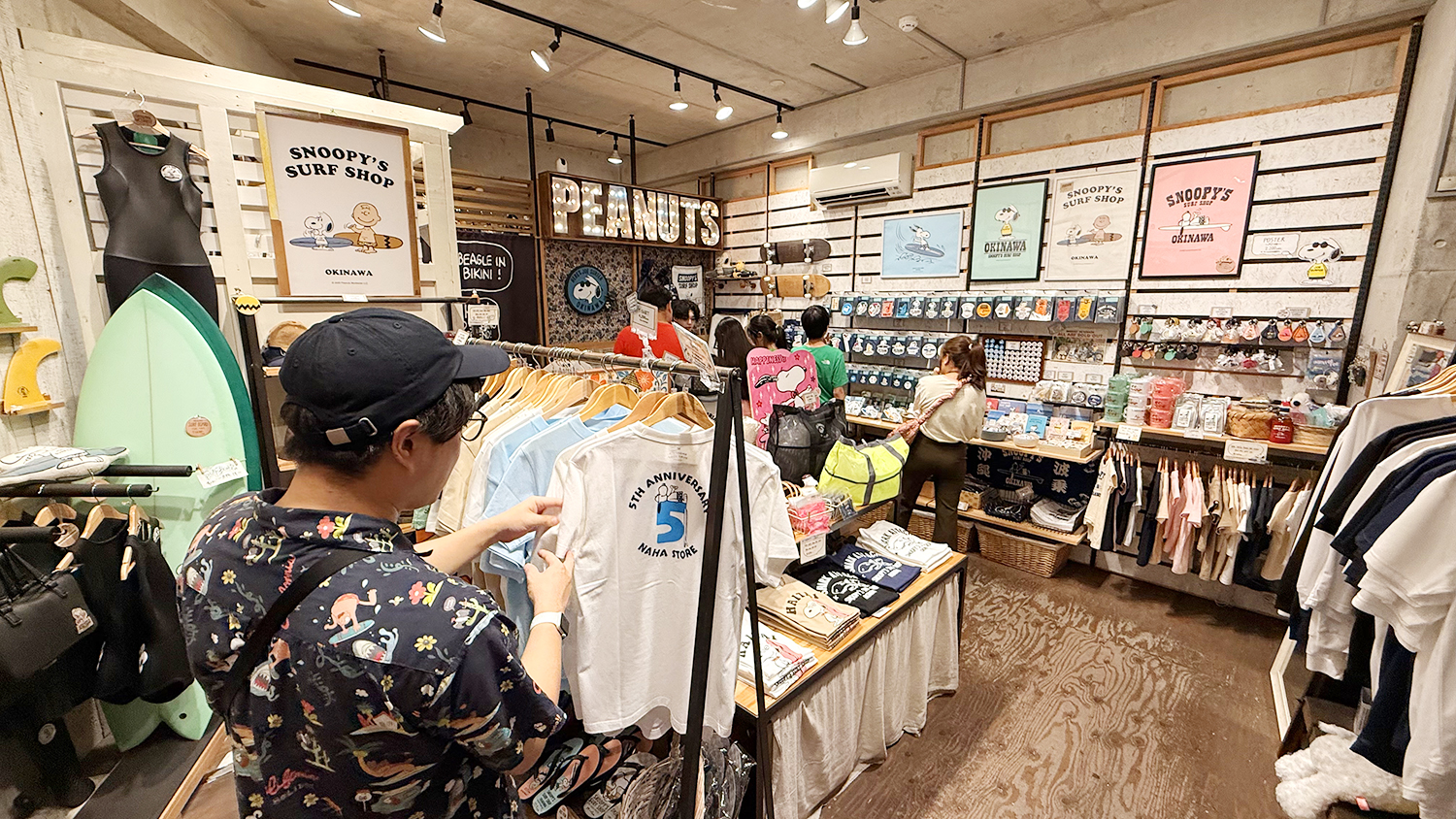ผมเริ่มต้นเดินแบบไม่รีบ แวะดูของเล็กน้อย ถ่ายรูปบ้างระหว่างทาง ก่อนจะเจอร้านหนึ่งที่อดแวะไม่ได้ — Snoopy’s Surf Shop ร้านธีมสนูปปี้สุดน่ารักที่ขายเสื้อผ้าและของฝากแนวชายทะเล บรรยากาศในร้านอบอุ่น เพลงเพราะ และมีกลิ่นหอมของเทียนกลิ่นมะพร้าวอ่อน ๆ ทำให้เผลออยู่ในนั้นเกินครึ่งชั่วโมง